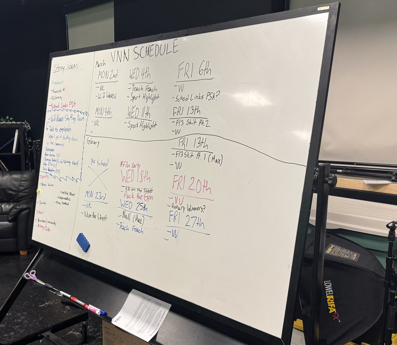 On the left is one of our many whiteboards in class displaying information, this one showing upcoming VNN episodes and what content is going to be featured in each one.